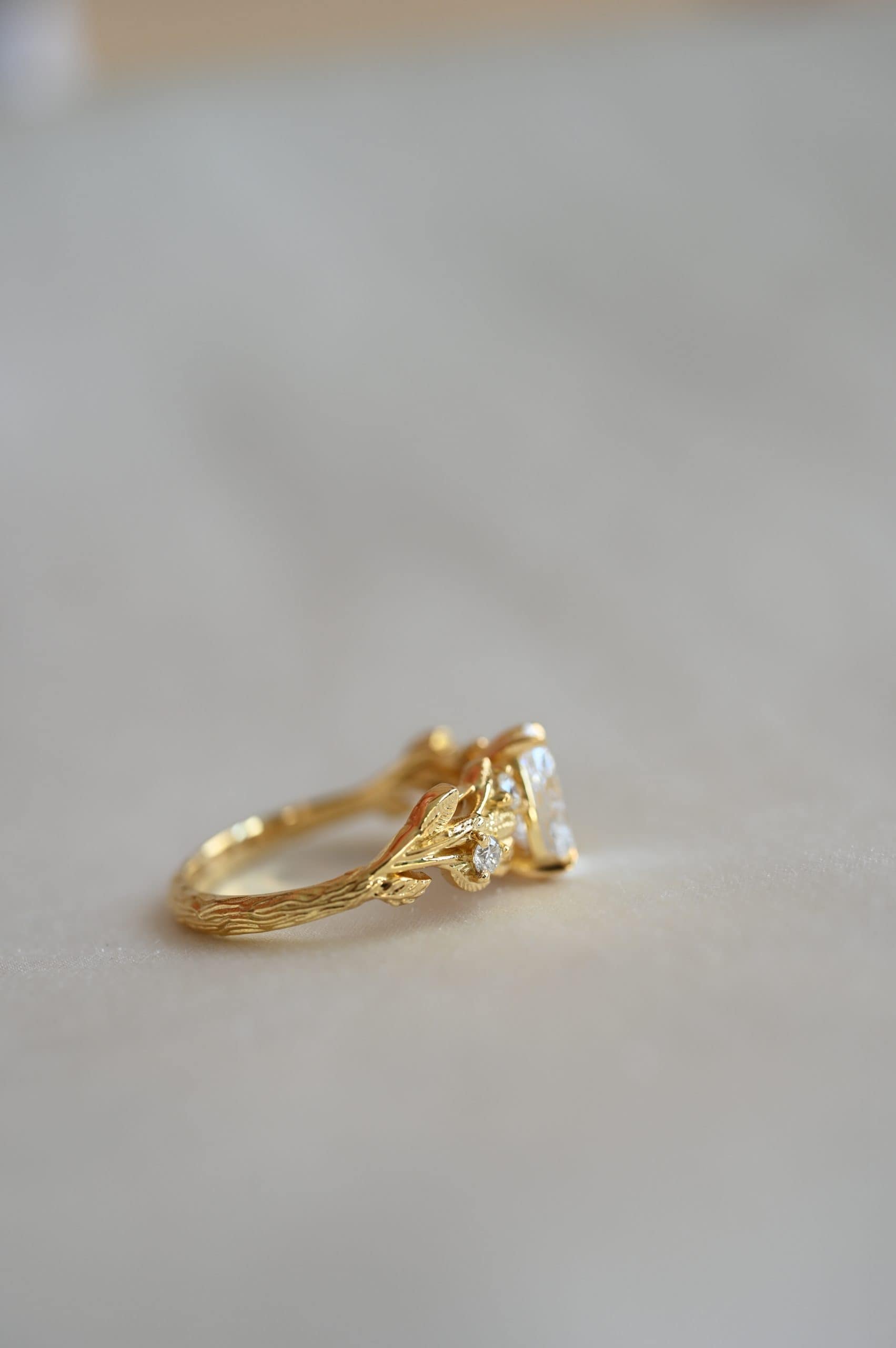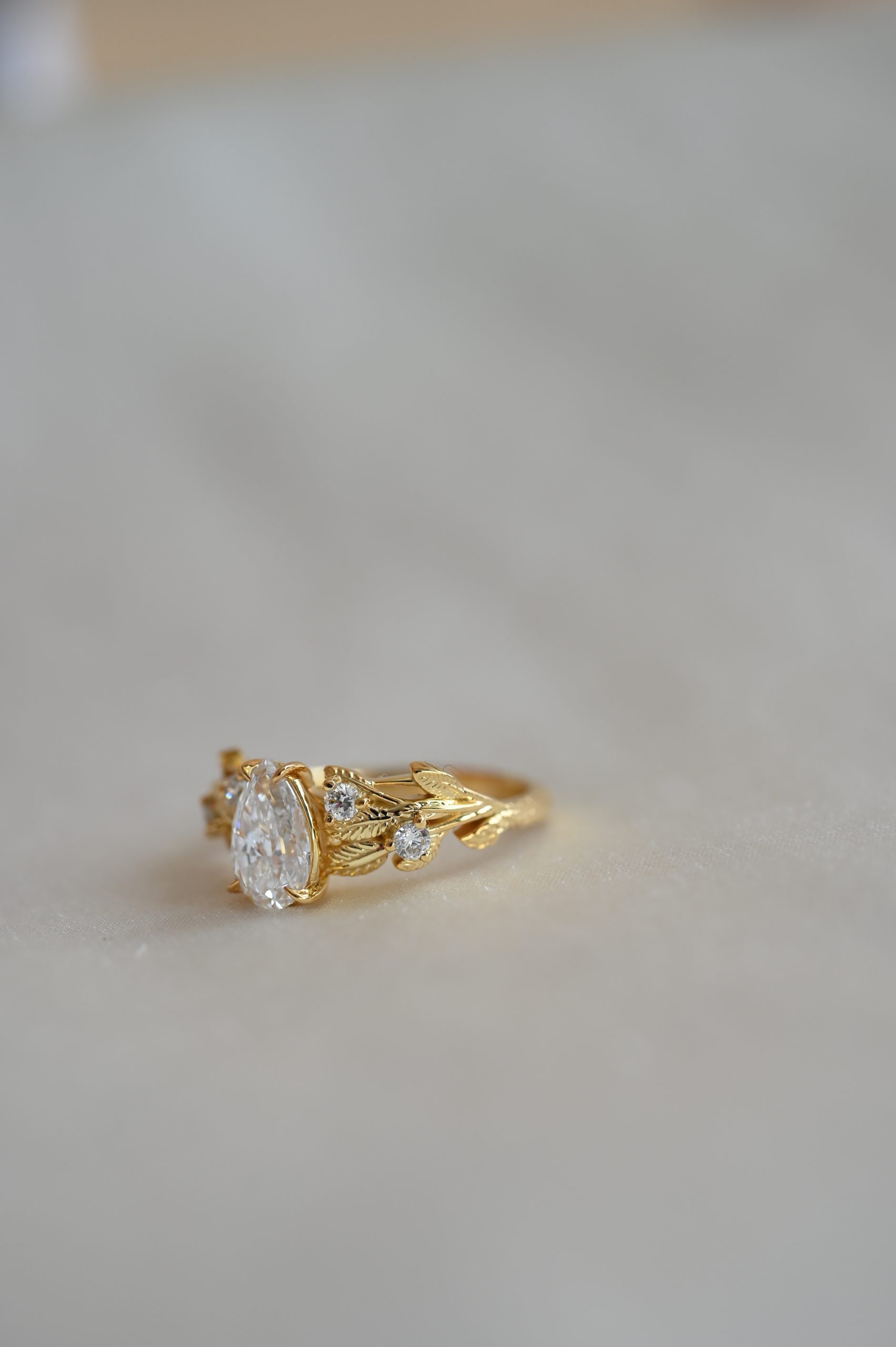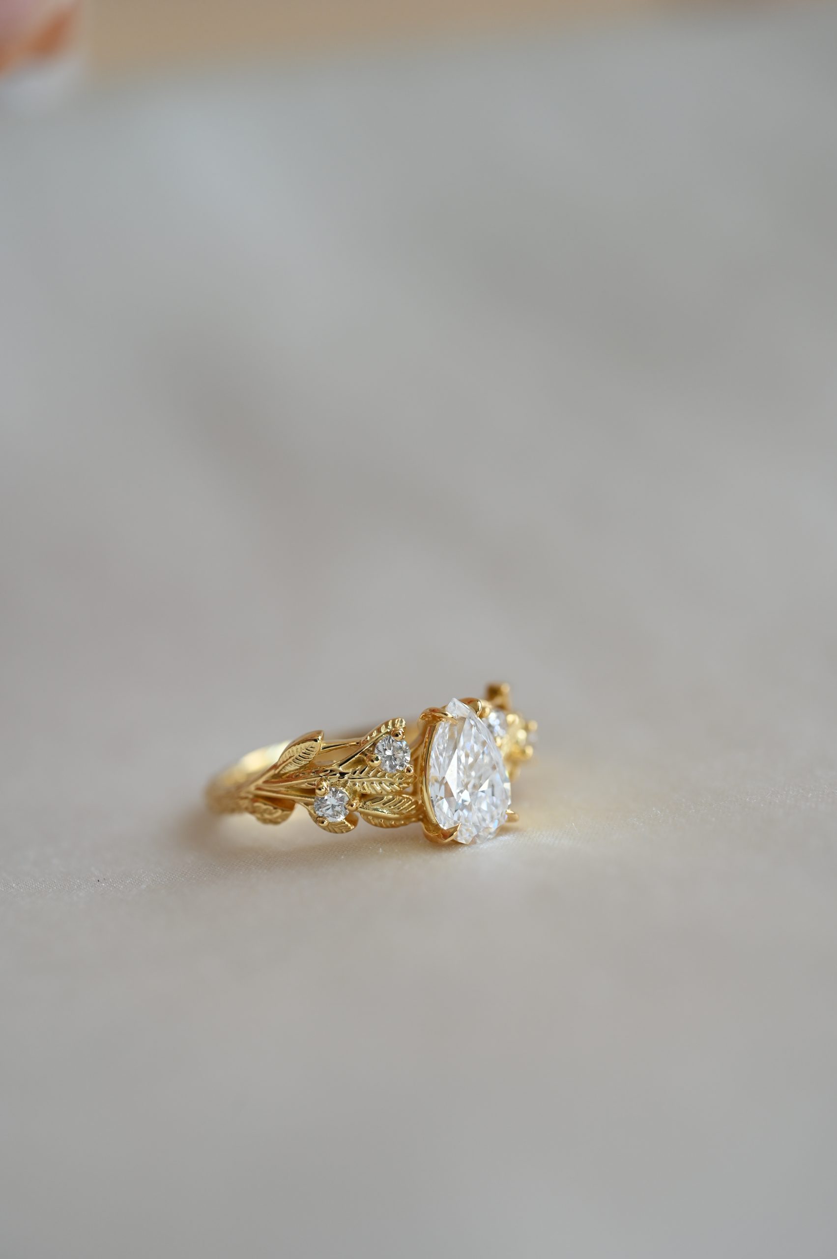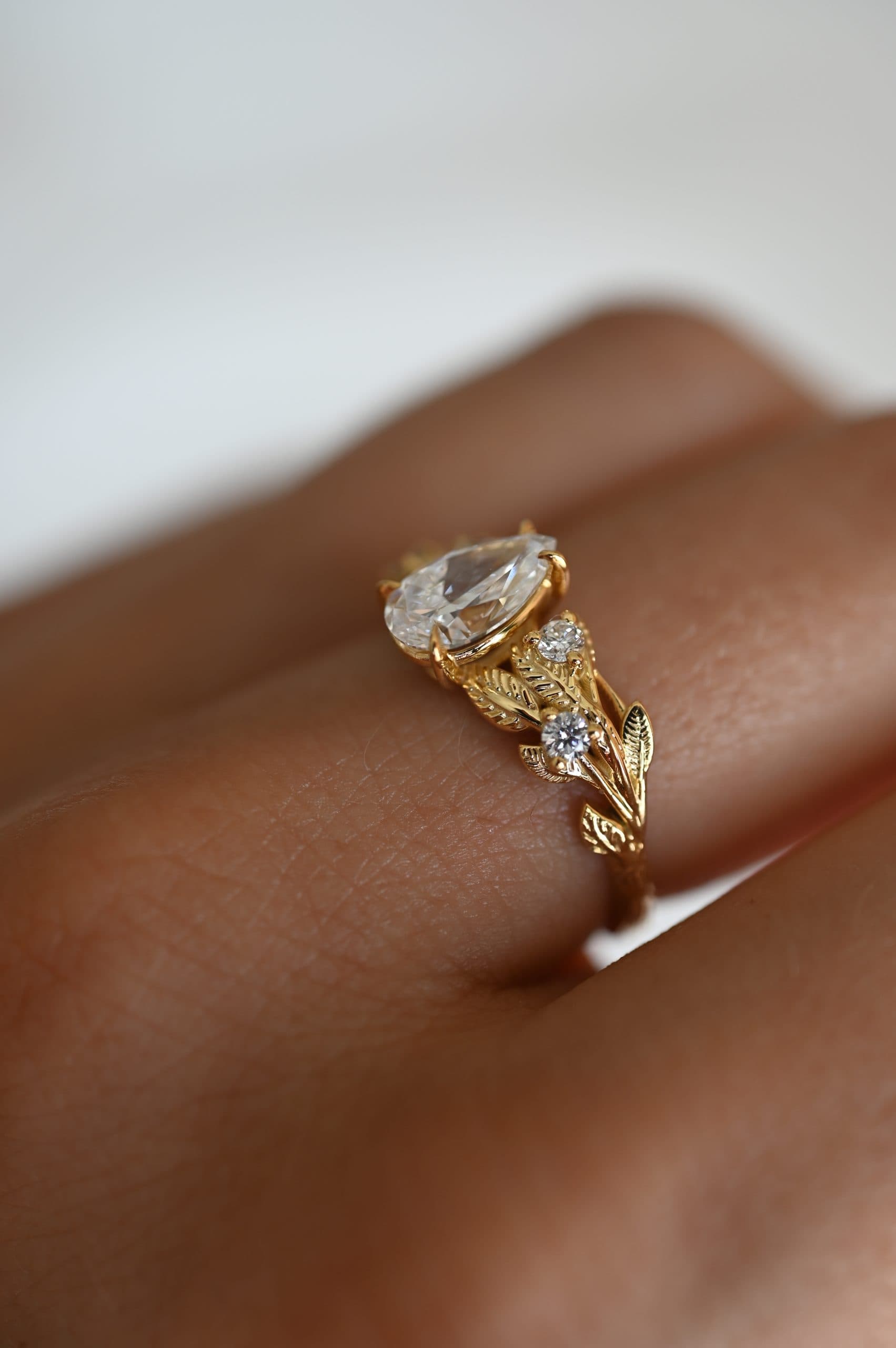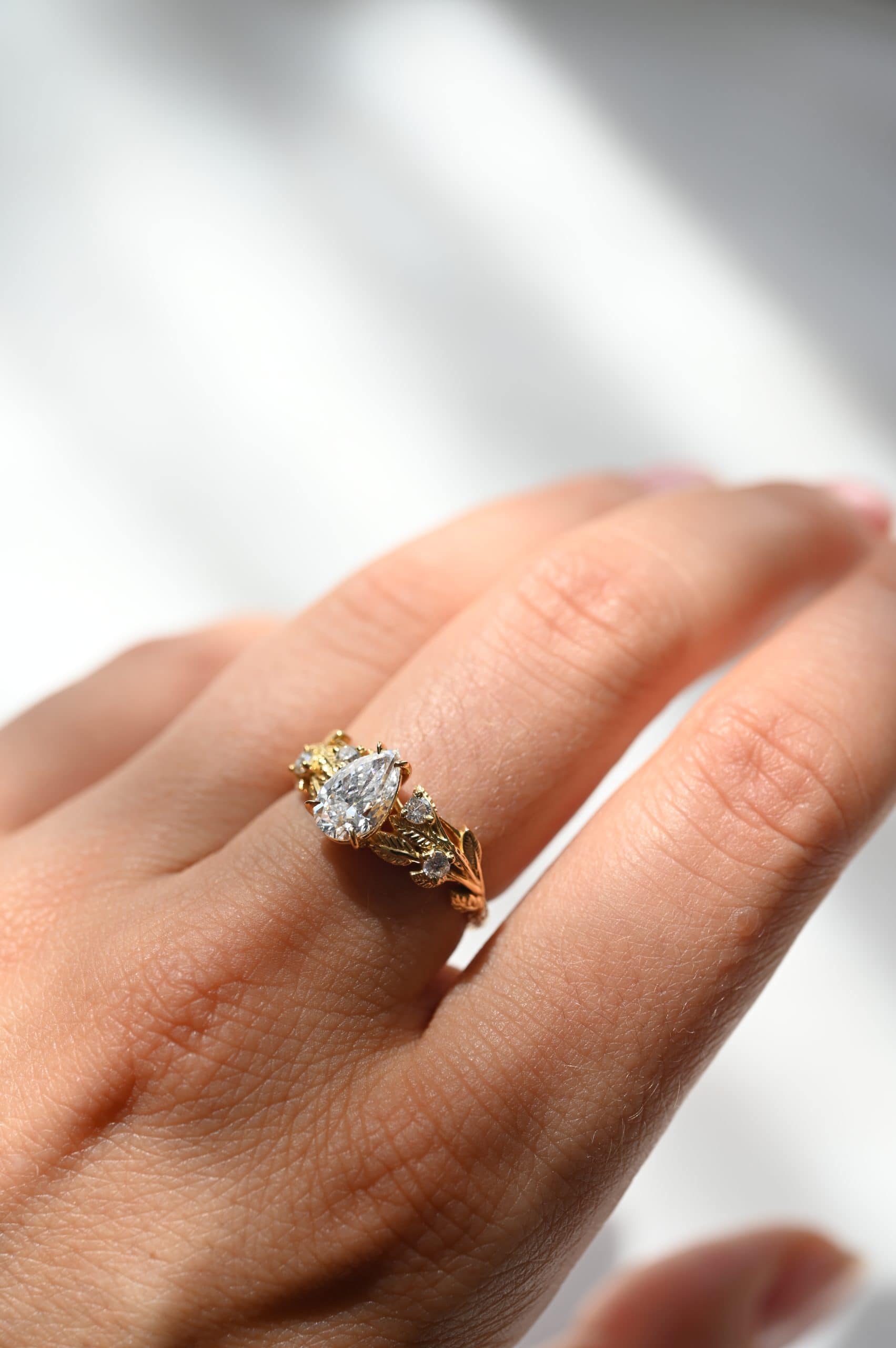 Флорален пръстен с централен камък диамант круша 0.92 карата изработен в 18к злато. От двете