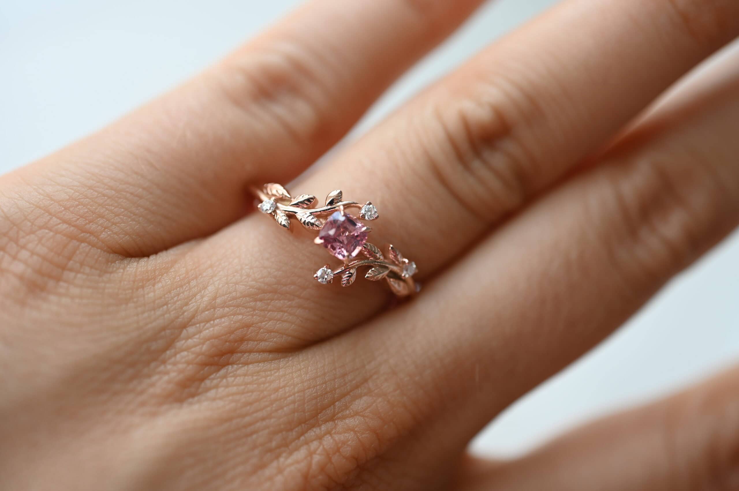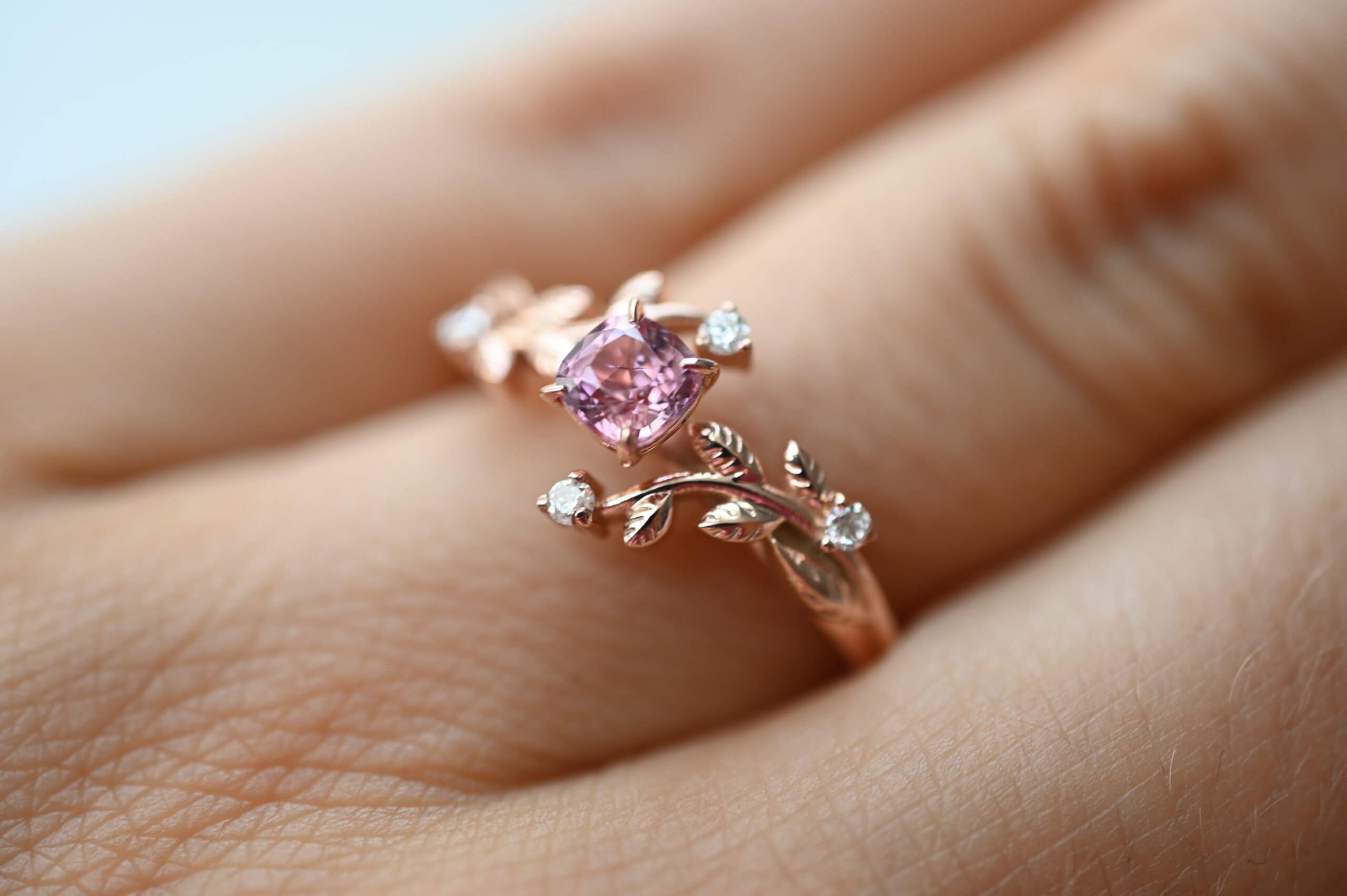 Нежен пръстен с листа и камъчета изработен в 14к розово злато. Централният камък е розов шпинел с произход Могок монтиран в каса с орлови зъбчета. Между листата са монтирани 4 диаманта 1.2мм.